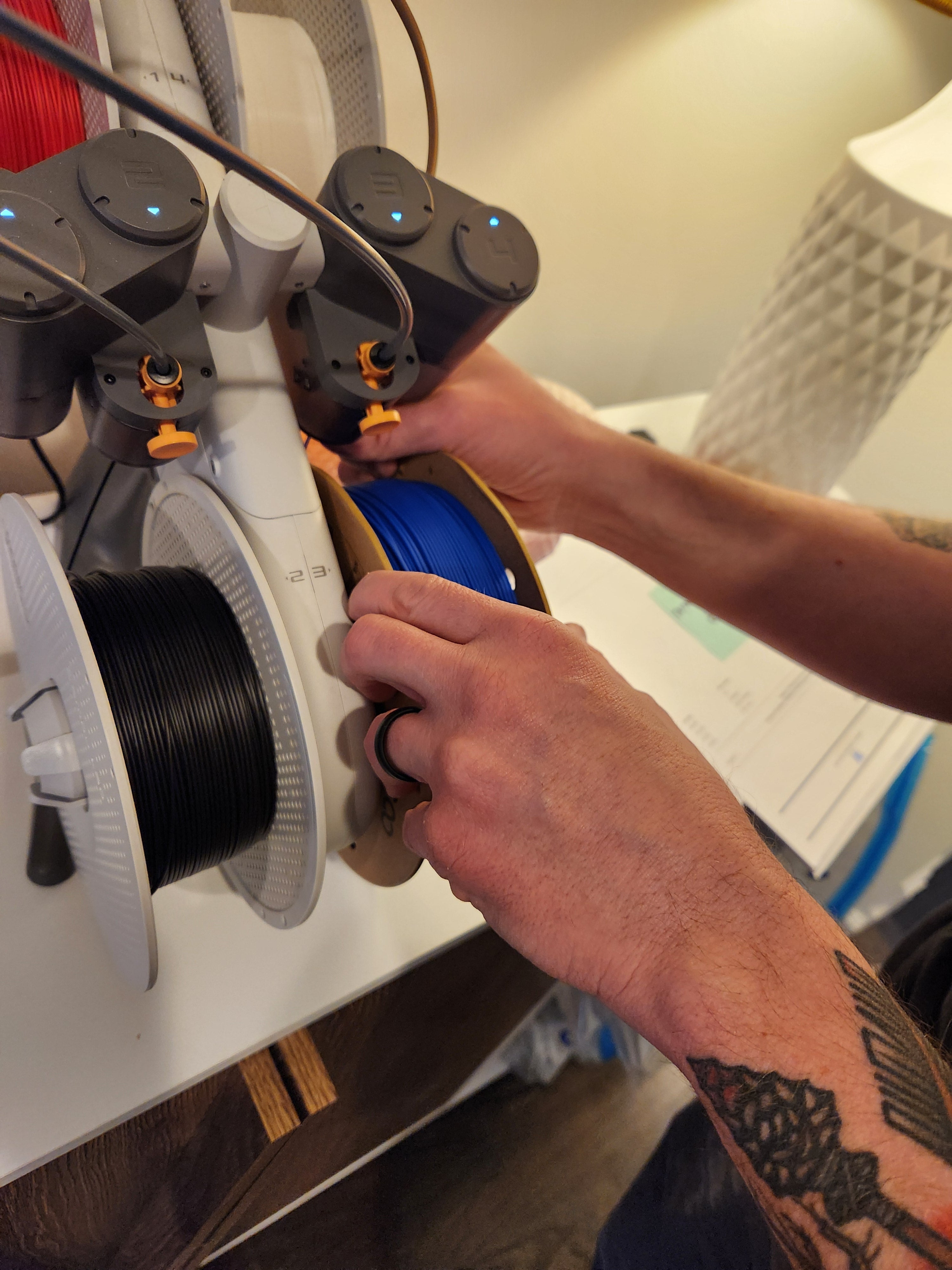 We go through a LOT of Buffalo Blue filament. This spool was being loaded up so we could run overnight to fulfill all our orders for MVP keychains.